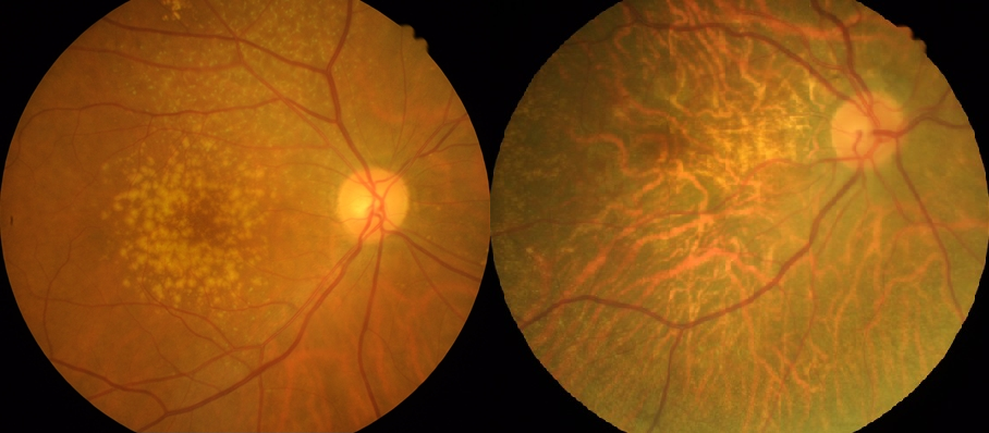 근시로 인해 눈이 지속적으로 길어지면서 황반의 망막, 맥락막과 색소상피가 얇아지고 위축됩니다. 주로 30대 이후로 발생하며, 맥락막하 신생혈관으로 인한 장액성 및 혈액성 황반변성으로 시력이 저하됩니다.