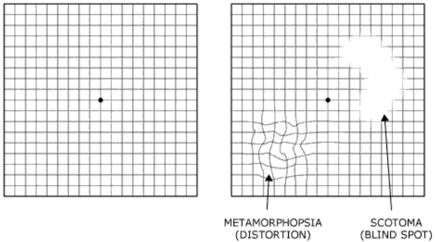 정밀안저검사를 시행하며 빛간섭단층촬영을 통해 황반부의 구조를 자세히 검사하여 진단이 가능합니다. 하지만 집에서도 암슬러 격자를 이용하여 간단히 검사해볼 수 있습니다. 안경 착용자는 안경 착용, 돋보기 착용자는 돋보기 착용 후 한쪽 눈을 가리고 반대편 눈으로 암슬러 격자를 약 30cm 거리에서 암슬러 격자 가운데에 위치한 점에 초점을 맞추고 주시합니다. 반대편 눈도 같은 방법으로 검사합니다. 이 때 시야에 들어오는 모든 선이 수직/수평이어야 하며 모든 사각형이 같아야 합니다. 만약 선이 휘어져 보이거나 선이 끊어져 보이는 등의 이상이 있을 경우 황반변성, 황반원공, 망막앞막, 중심장액맥락망막병증 등의 질환의 가능성이 있으므로 안과에서 정밀검사가 필요합니다.