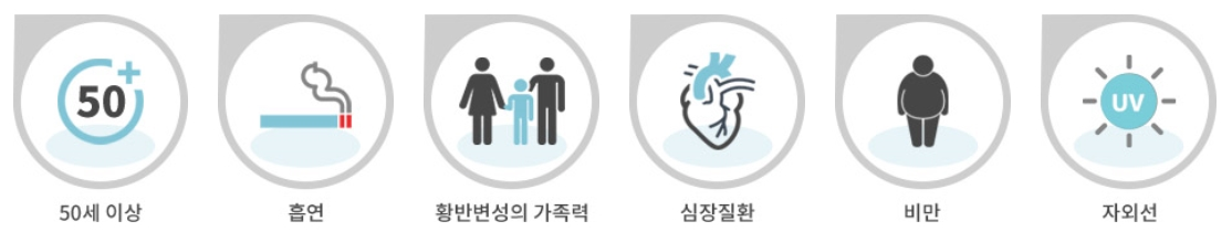 명확하게 밝혀지지 않았지만 고령, 흡연, 유전적 특성, 고혈압 등 심혈관계질환, 고지혈증, 반대 눈의 황반변성 기왕력, 가족력, 비만, 자외선 등이 있습니다.