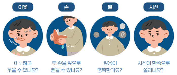 급박한 상황에서 뇌졸중을 판단해 볼 수 있는 방법이 있다. 대한뇌졸중학회는 ‘이웃·손·발·시선’으로 요약한 주요 증상 판단법을 제시한다. ‘이’라는 소리를 입으로 길게 내며 웃을 수 있는지, 두 손을 앞으로 뻗을 수 있는지, 발음이 명확한지, 시선이 한쪽으로 쏠리는지 등 4가지를 우선 확인하라는 것이다. 김태정 학회 홍보이사(서울대병원 신경과 교수)는 “뇌졸중은 갑자기 발생하는 것이 특징이라 1분 전까지 정상이었더라도 1분 후에 뇌졸중이 발생할 수도 있다”며 “‘이웃·손·발·시선’을 기억하는 것이 중요하다”고 말했다.